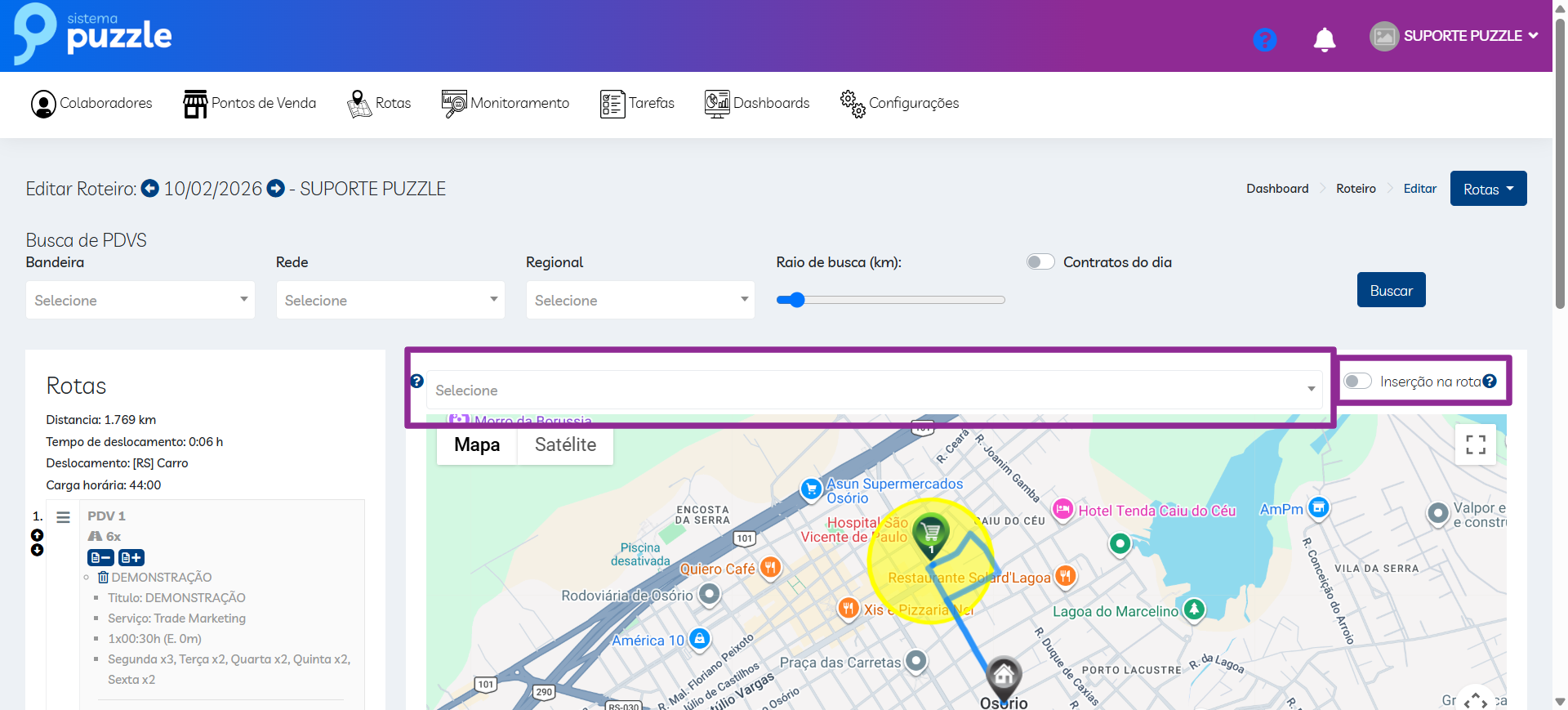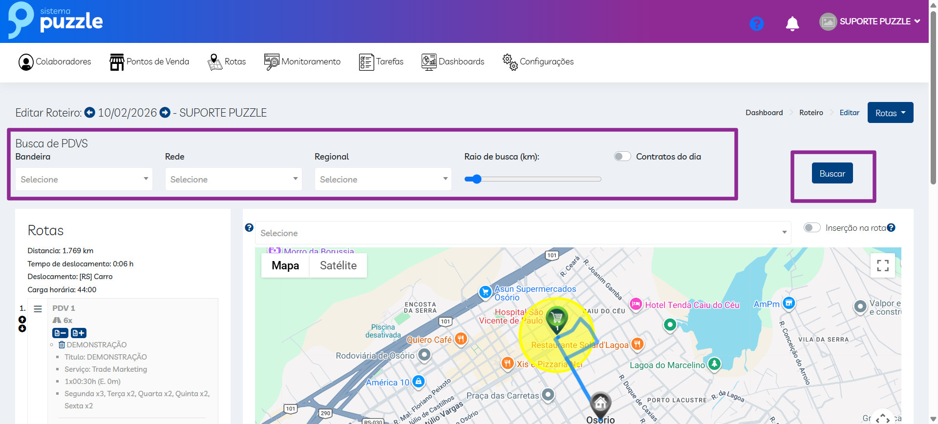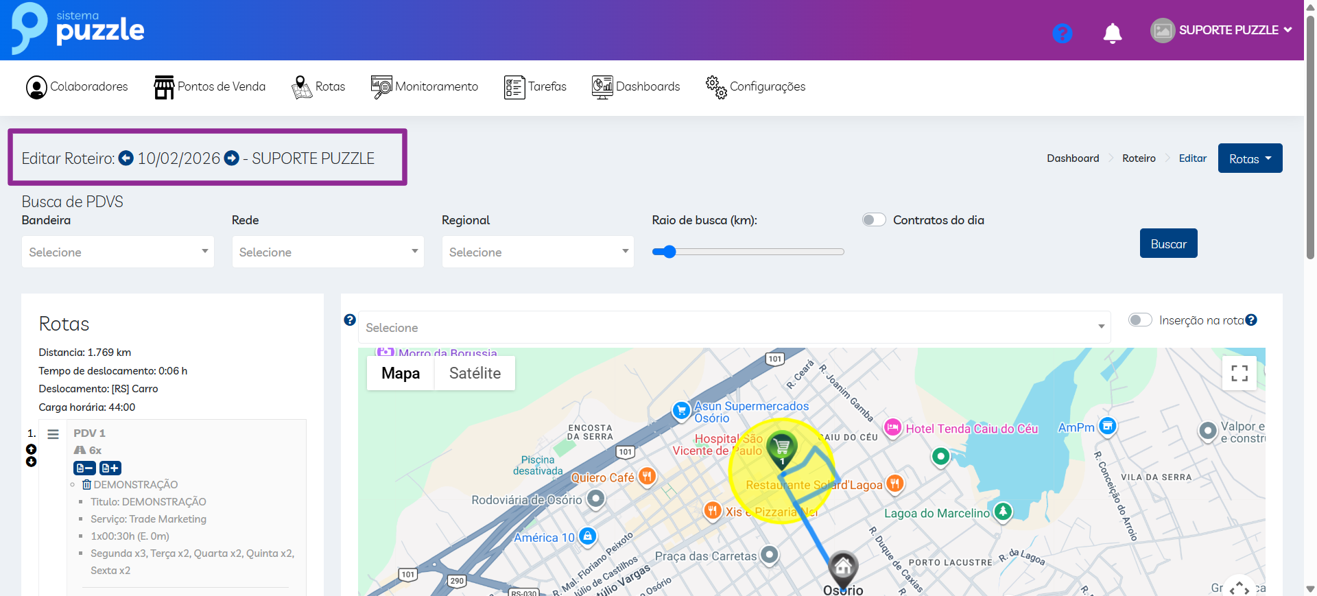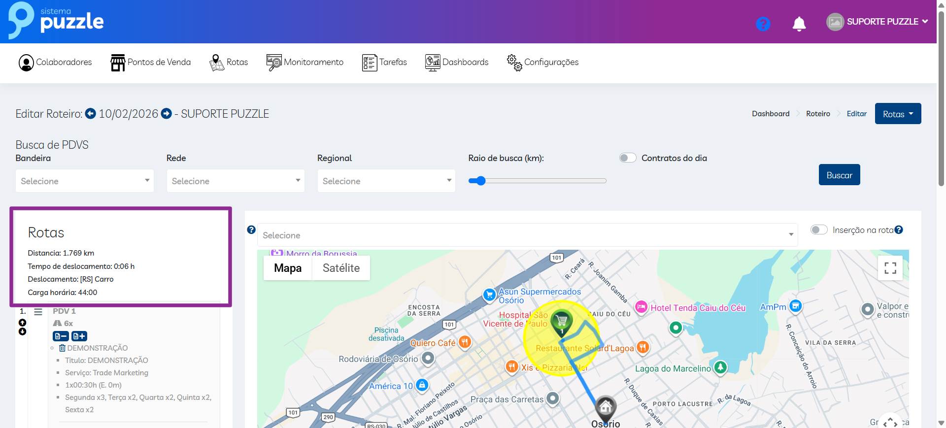 - No dia: PDV em rota no dia atual;