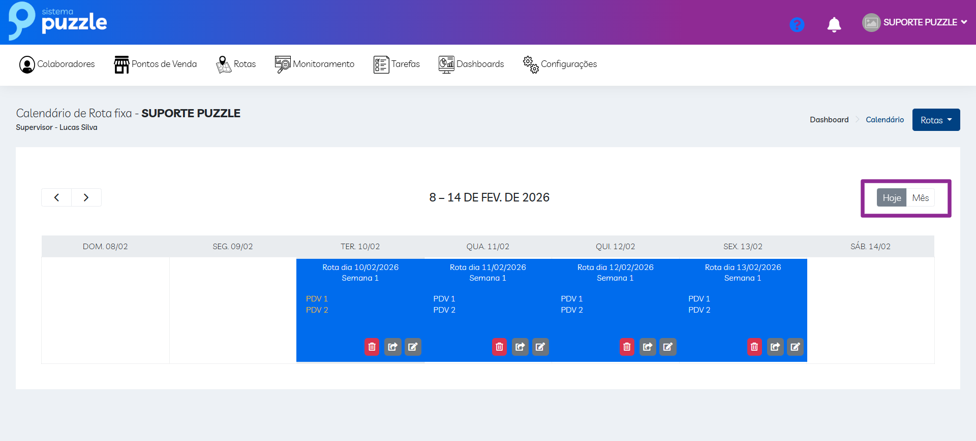 Essa alternância é feita pelos botões localizados no canto superior direito do roteiro, identificados como Hoje e Mês.