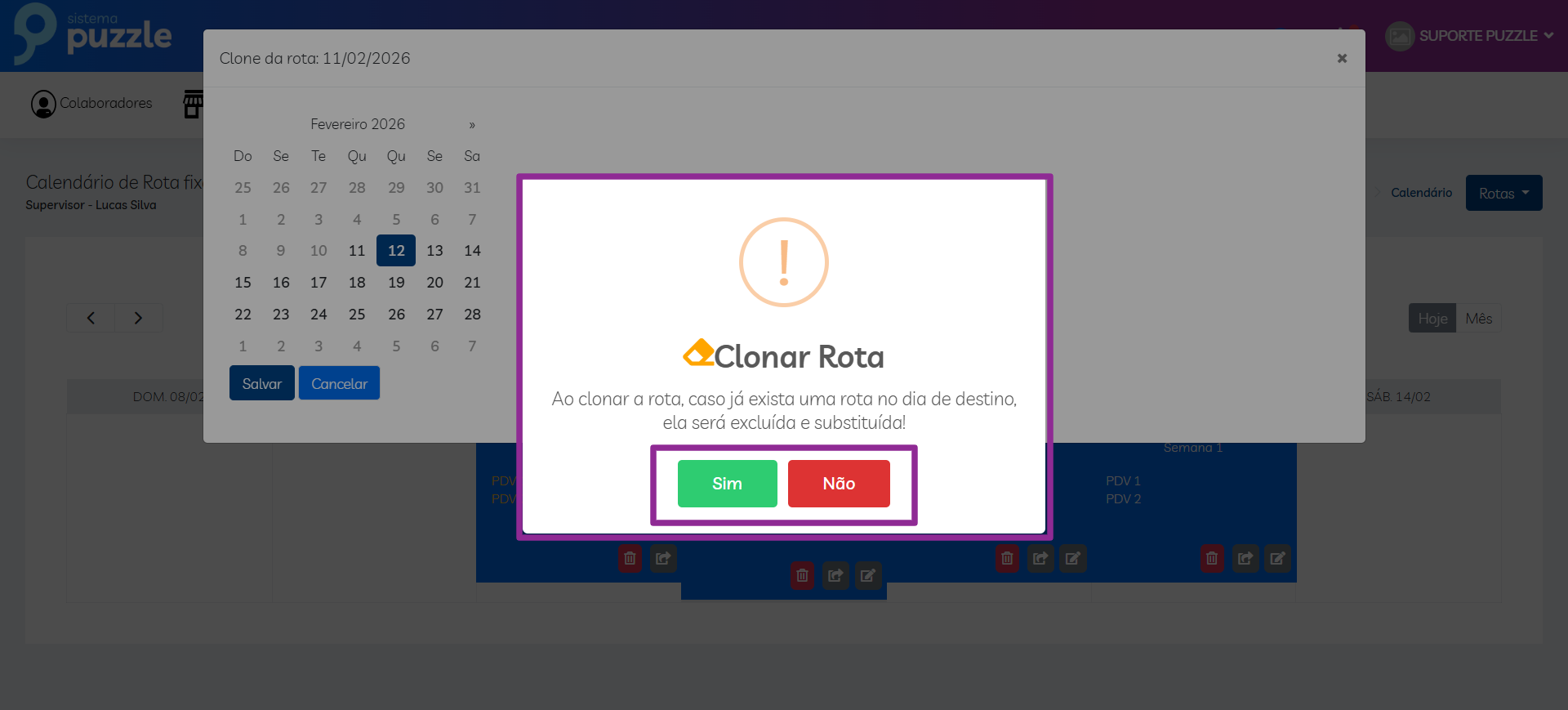 Ao selecionar a data, será exibida uma mensagem de confirmação, informando que a rota do dia escolhido será substituída;