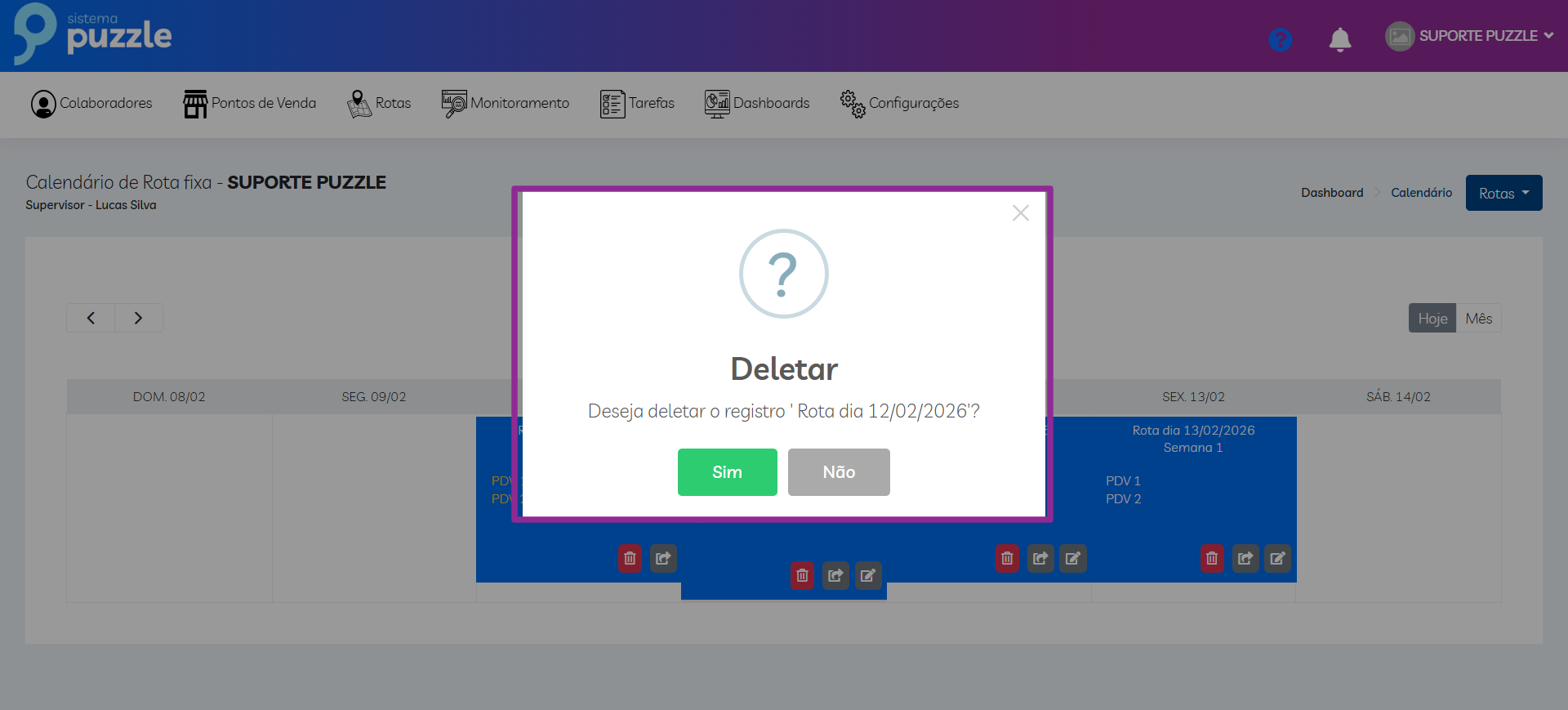 Também é possível excluir a rota de um dia específico.