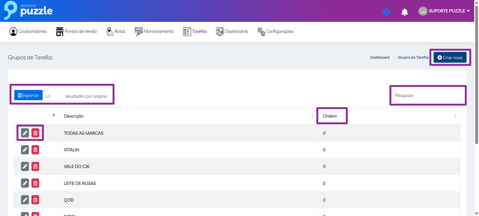 A coluna Ordem define a prioridade em que os grupos de tarefas serão exibidos no aplicativo do colaborador, quando a funcionalidade de ordem de prioridade estiver ativada.