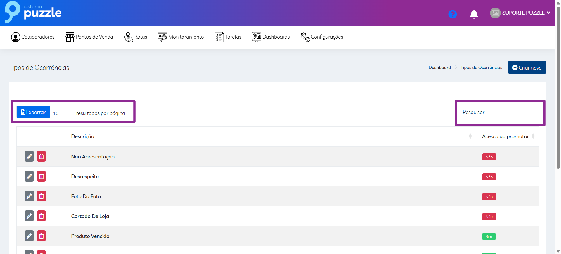Para exportar os tipos de ocorrências, clique no botão Exportar, localizado acima da tabela.Quantidade de resultados