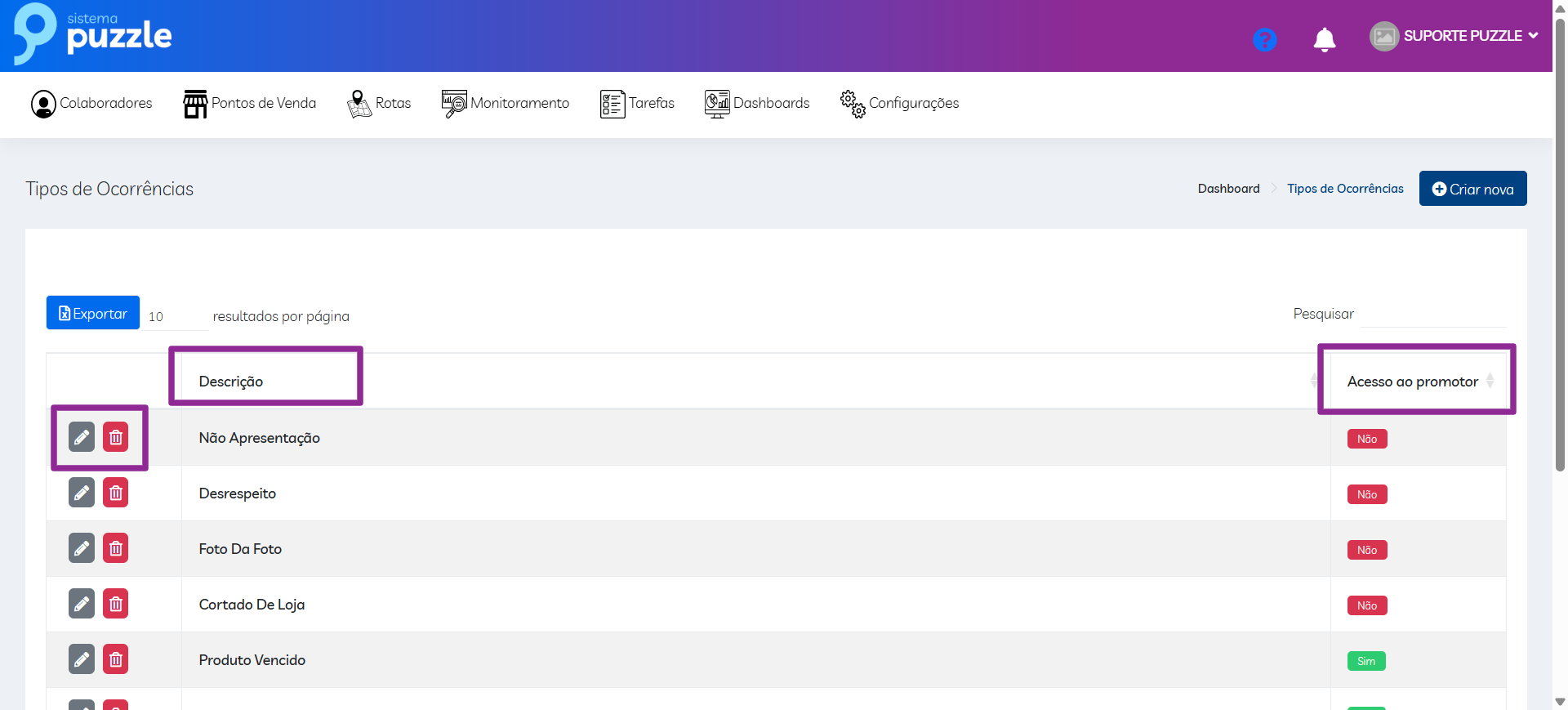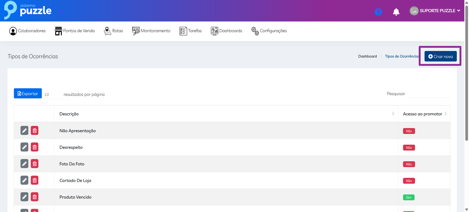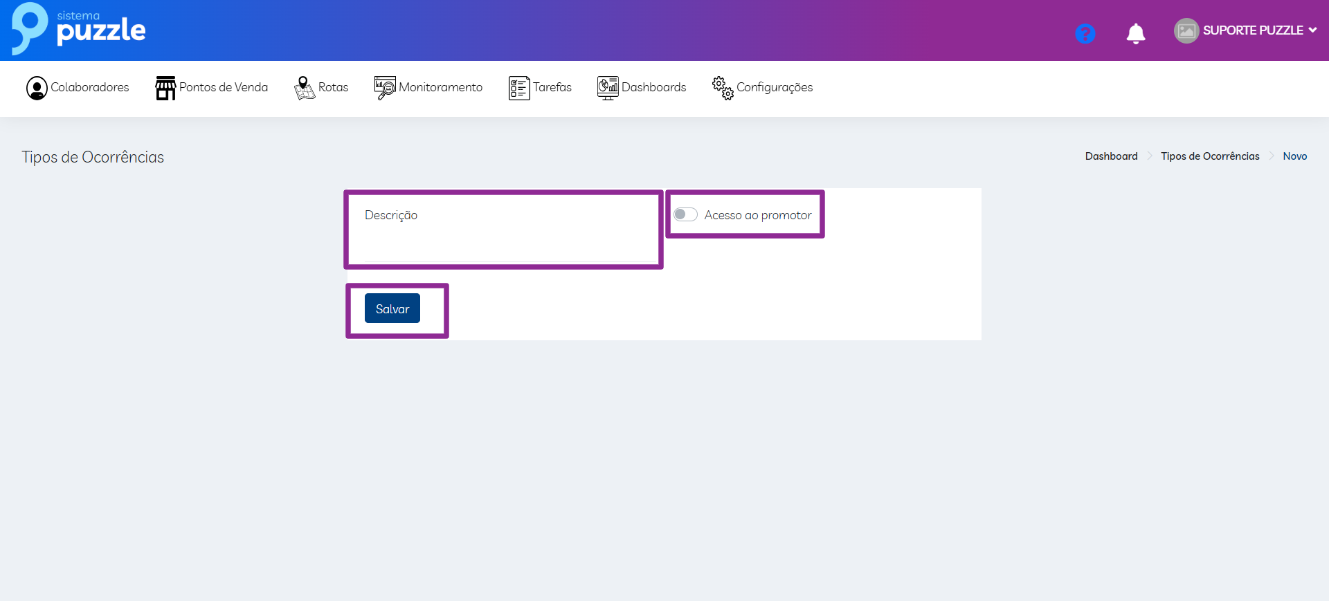Acesso ao Promotor: ao ativar esse botão, o tipo de ocorrência ficará visível no aplicativo para o time de campo.