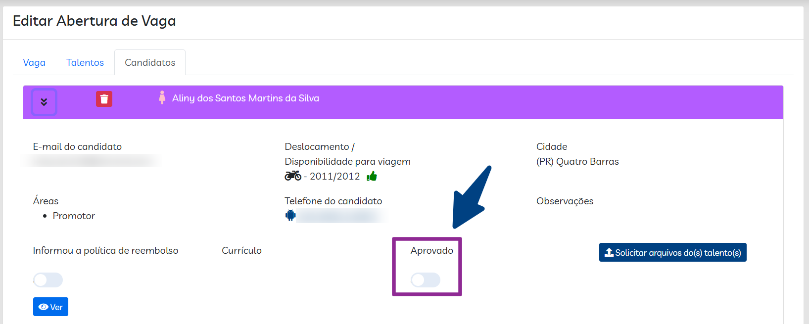 - A efetivação do candidato como colaborador só ocorre ao marcar Aprovado na aba Candidatos.