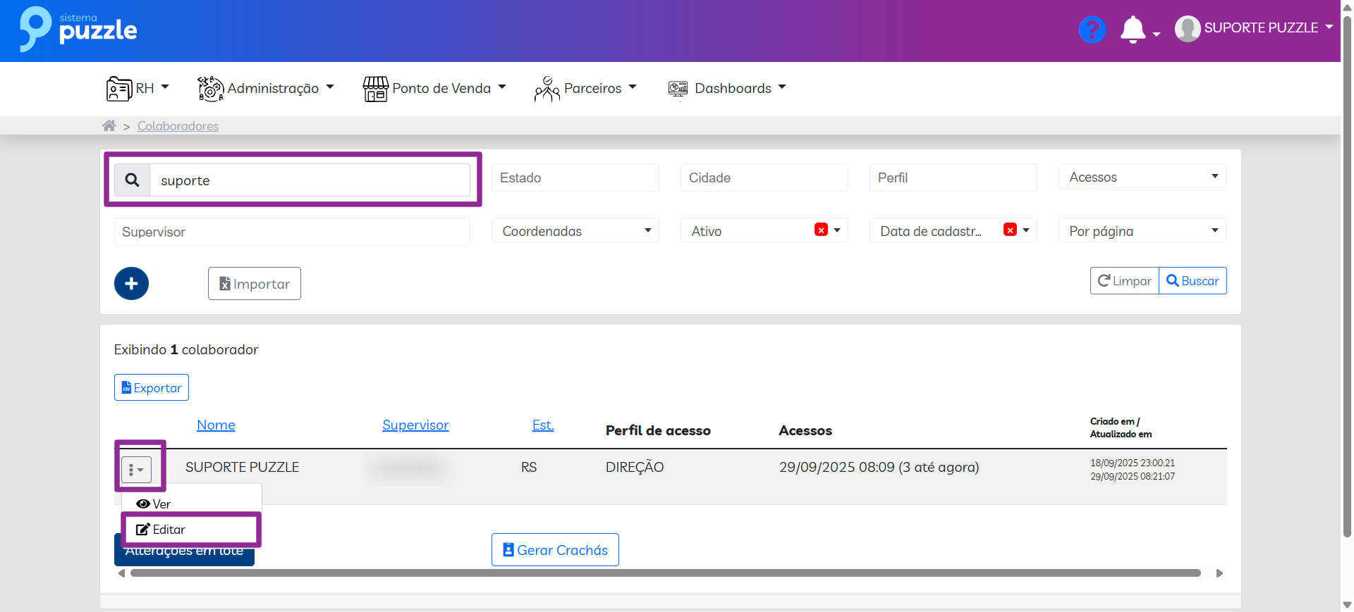 Localize o colaborador que deve ser desligado e clique em Editar.
