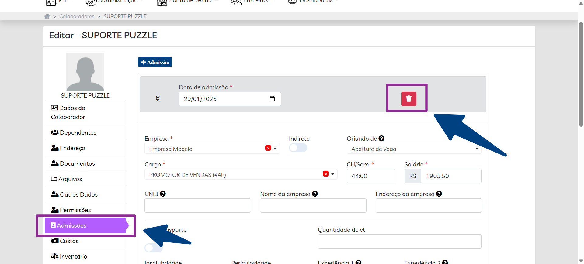 Ao lado da data de admissão, clique no ícone vermelho de lixeira.