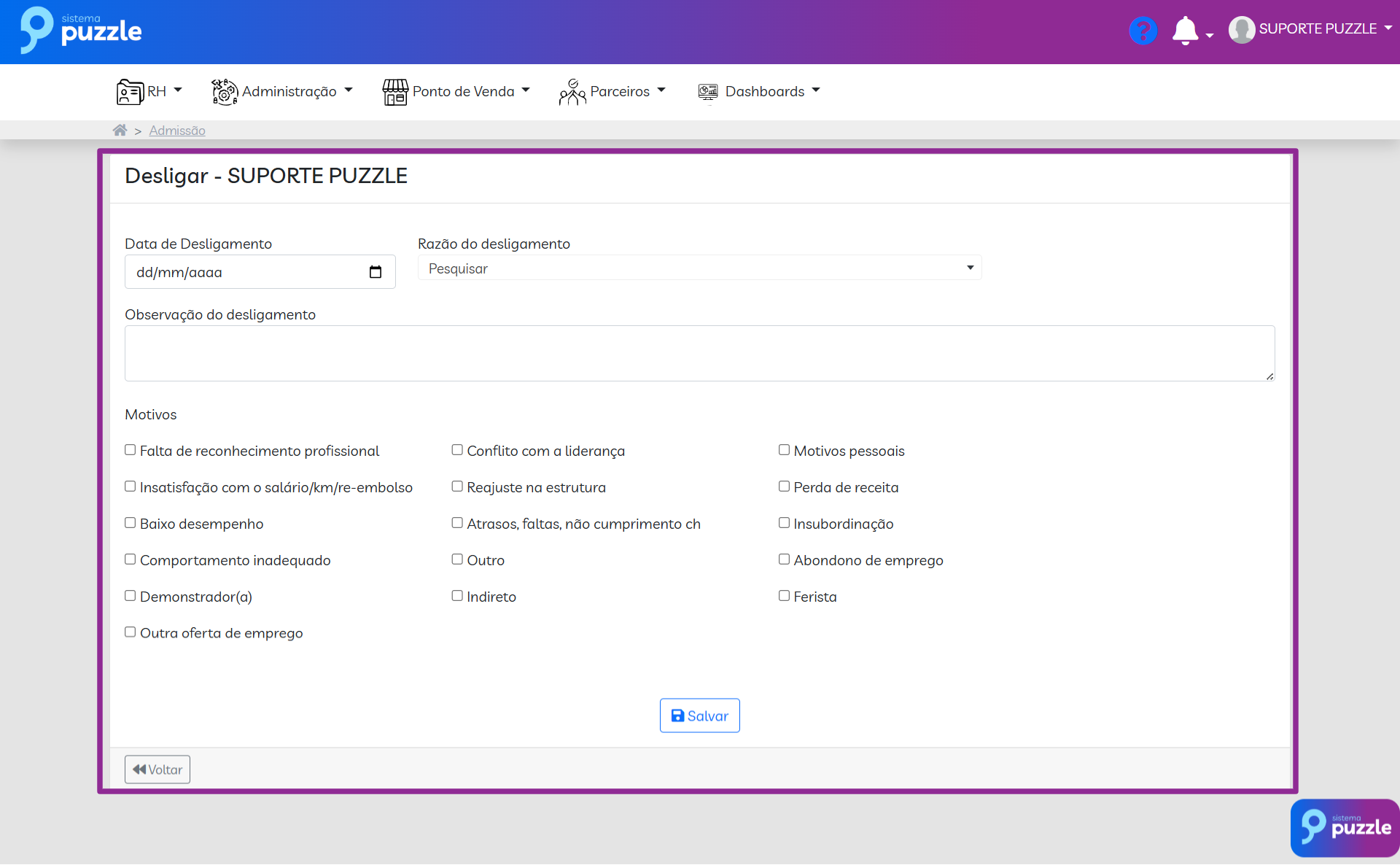 O processo de desligamento deve ser realizado sempre pelo Puzzle Planning, garantindo que os dados do colaborador sejam atualizados corretamente e que o sistema reflita a saída de forma imediata.