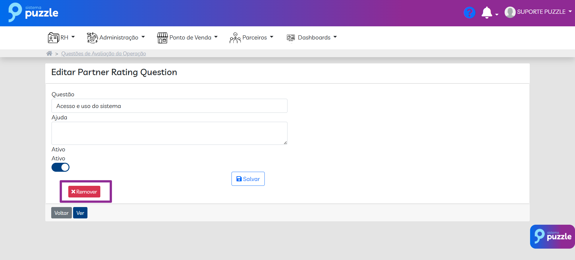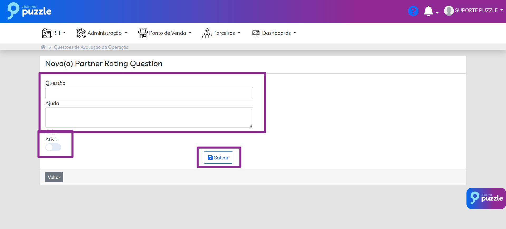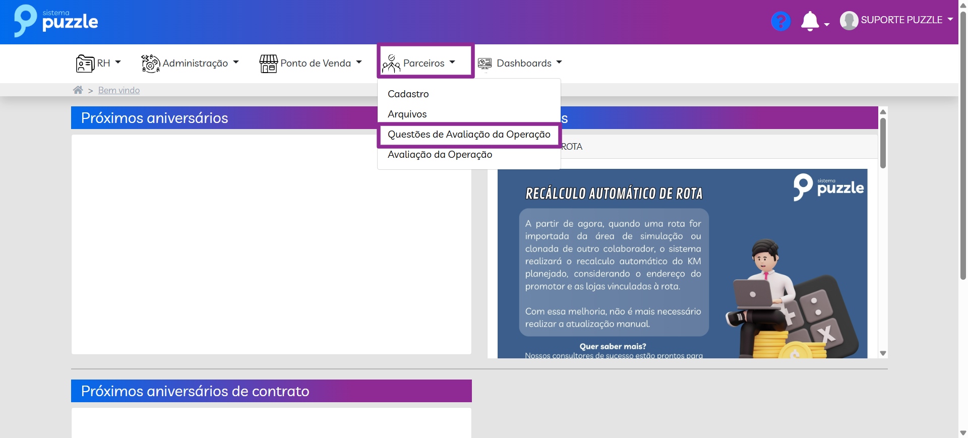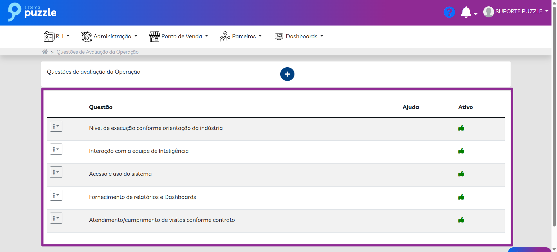 A funcionalidade Questões de Avaliação da Operação permite que você cadastre perguntas que serão aplicadas aos parceiros no primeiro acesso de cada mês. O objetivo é avaliar, sob a perspectiva do parceiro, como estão os atendimentos e demais aspectos da operação.